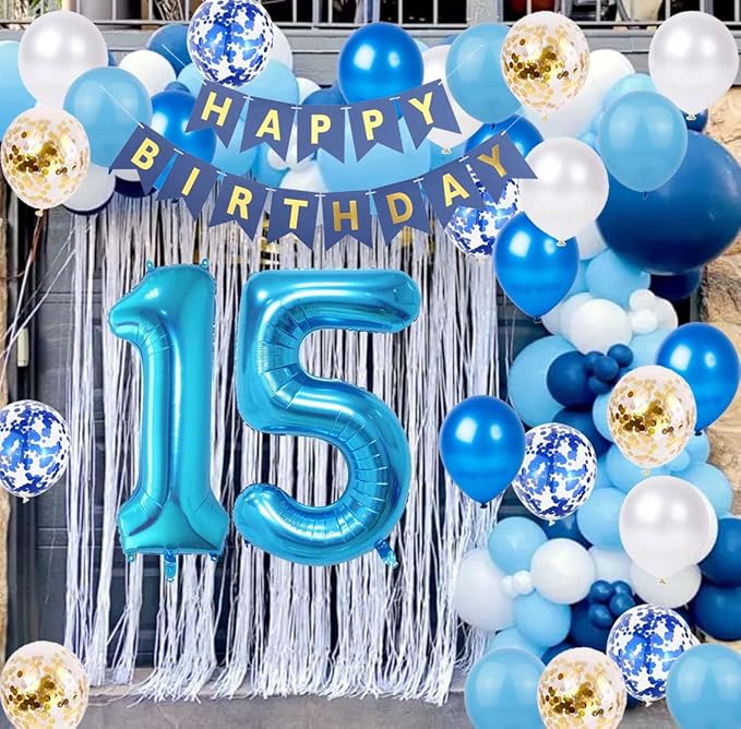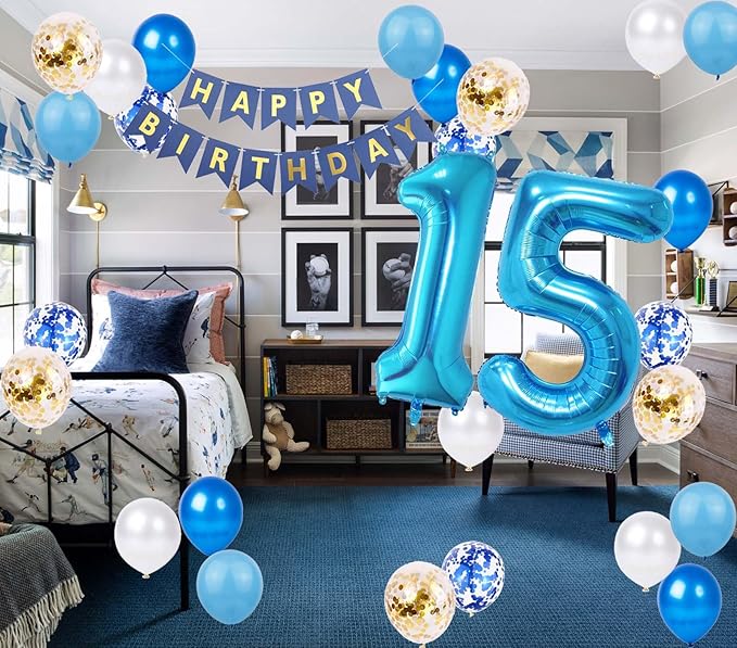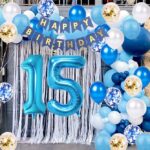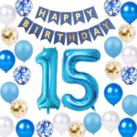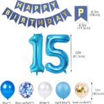 Blue & Gold 15th Birthday Decorations for Boys – Happy Birthday Banner, Number 15 Foil Balloons, Latex & Confetti Balloons Party Set