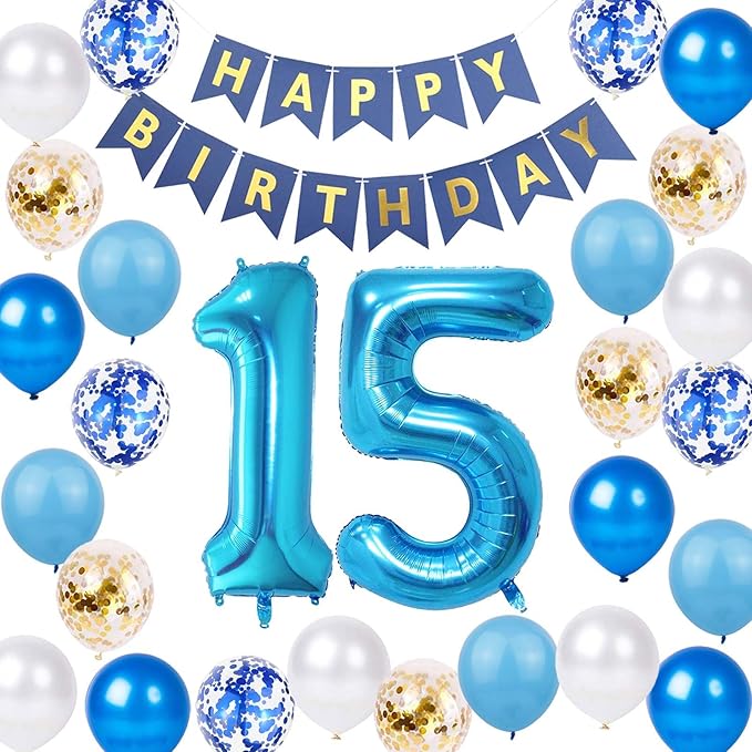 Be the first to review “Blue & Gold 15th Birthday Decorations for Boys – Happy Birthday Banner, Number 15 Foil Balloons, Latex & Confetti Balloons Party Set”