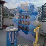 A soft and elegant hot air balloon theme decoration designed for a baby boy’s 1st birthday, featuring a photo display frame, balloon styling, and a glowing birthday number.