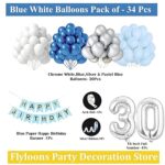 Flyloons 30th Birthday Decoration Kit – Blue & White Theme for Boys, Girls, Men & Women | 30 Pcs Blue, White & Silver Balloons | Party Decoration Set
