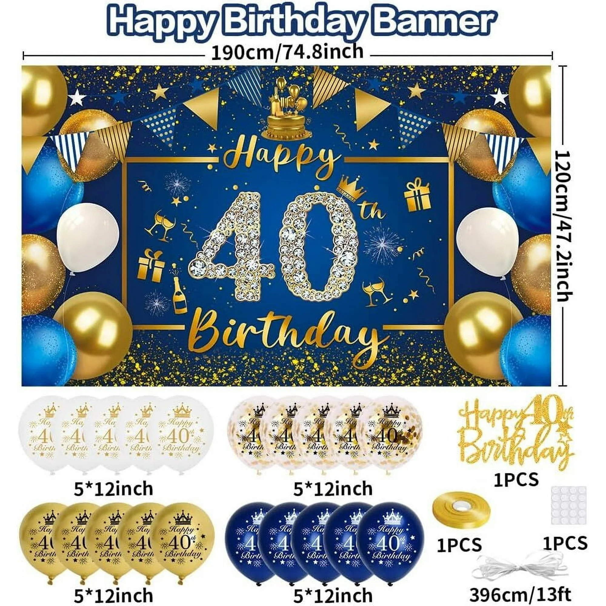 40th Birthday Decoration Kit – Blue & Gold Theme for Men | Happy Birthday Banner, Triangle Flag Banner, Gold Confetti Balloons | 40th Birthday Party Décor Set