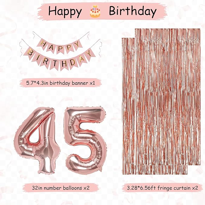 45th Rose Gold Birthday Decorations for Boys – Happy Birthday Banner, Fringe Curtains, Heart Foil & Confetti Balloons, Cake Topper