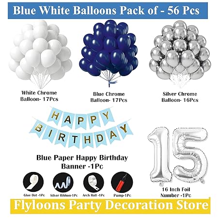Mystic Toy Store 15th Birthday Decoration Kit for Boys Blue and White Theme Combo | 50 Pcs Blue, White & Silver Balloons with Blue “Happy Birthday” Banner | Party