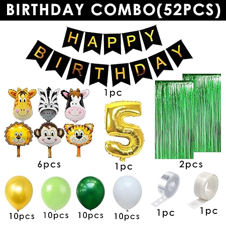 Party Propz 5th Birthday Jungle Party Decoration Kit – 52pcs Decorations for Boys Fifth Birthday Items with 30–32 Inch Huge Animal Foil Balloon