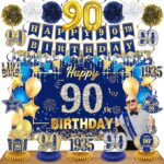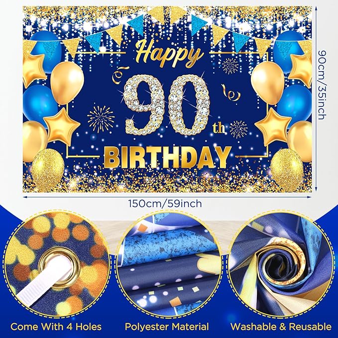 90th Birthday Navy Blue & Gold Party Decorations – Banner, Honeycomb Centerpiece, Swirls & Paper Pompoms