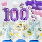 Sweet 100th Birthday Decorations – Purple Number 100 Foil Balloons Set, Happy 100th Birthday Party Supplies with Latex Balloons, Elegant Purple Theme Birthday Decor & Gifts for Girls