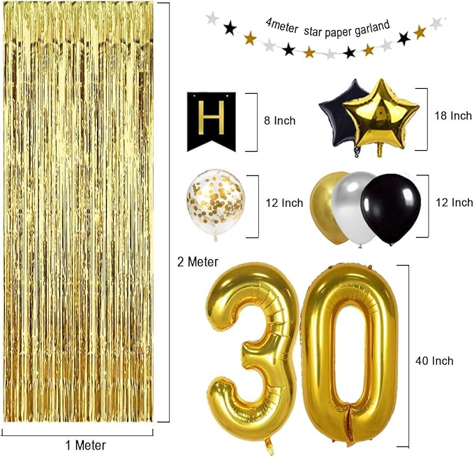 Black and Gold 30th Birthday Decorations Banner Balloon