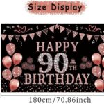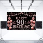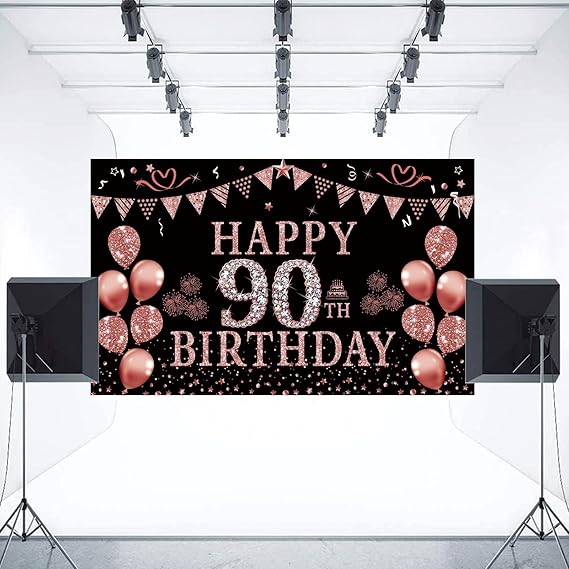 Rose Gold 90th Birthday Decoration Set. Featuring a beautiful “Happy 90th Birthday” backdrop banner, this set is perfect for women